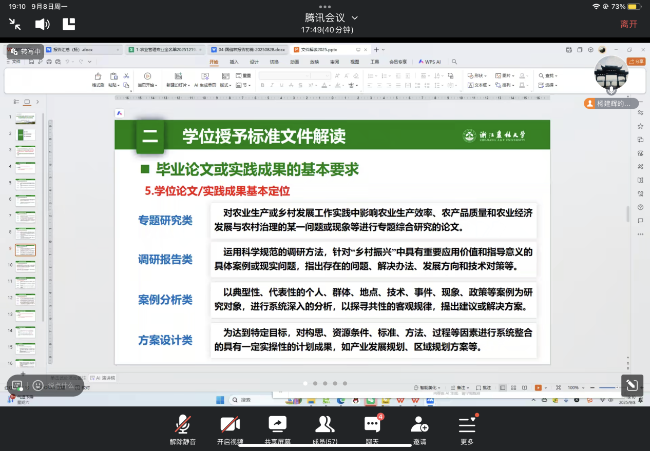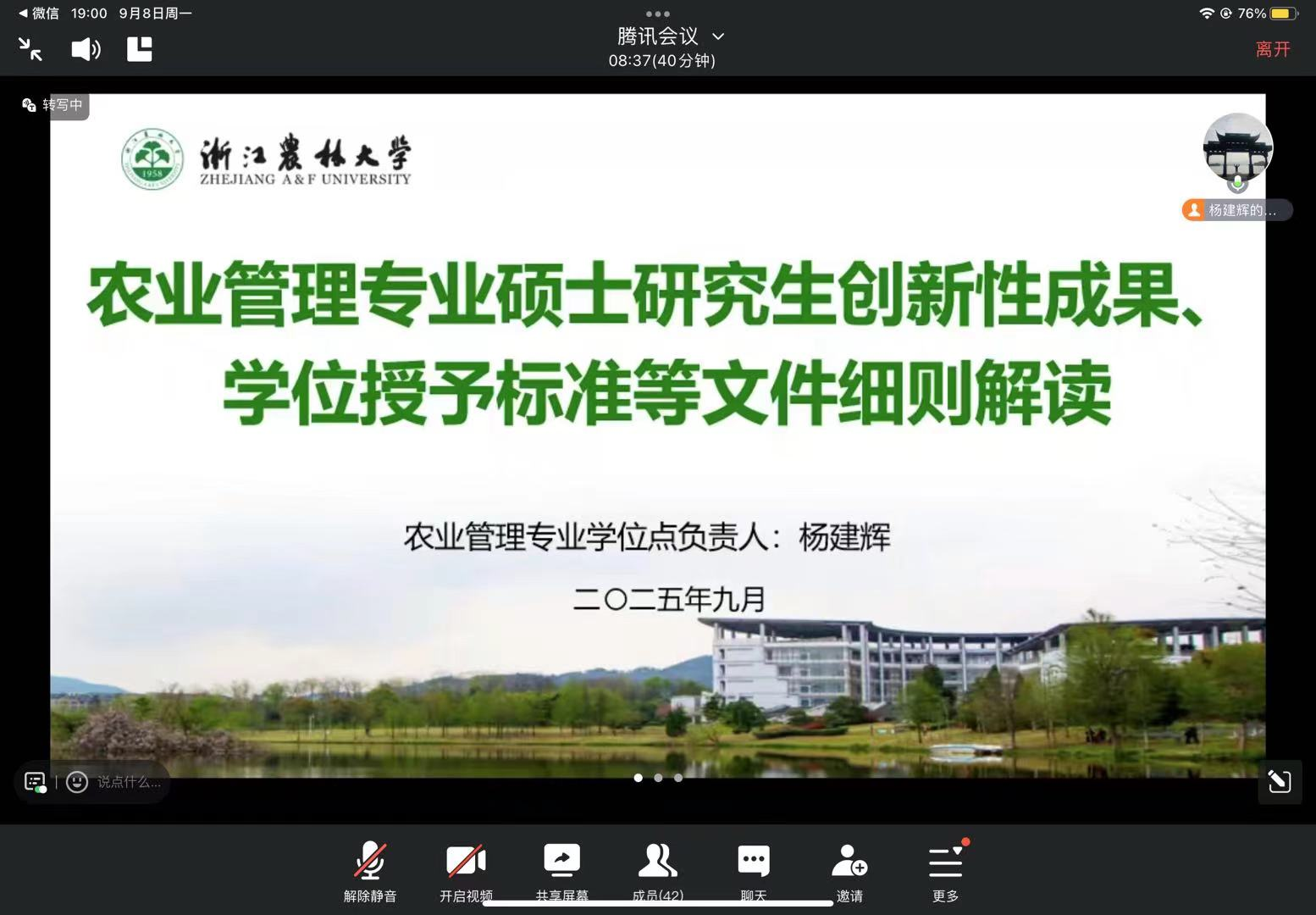 9月8日19:00,农业管理专业学位点举行“农业管理专业硕士研究生创新性成果、学位授予标准等文件细则解读会”,考虑到涉及不在校的非全日制研究生,本次培训线上举行,会议由农业管理专业学位点负责人杨建辉老师主讲,2023级、2024级全日制研究生及2022级非全日制研究生共66人在线参加。